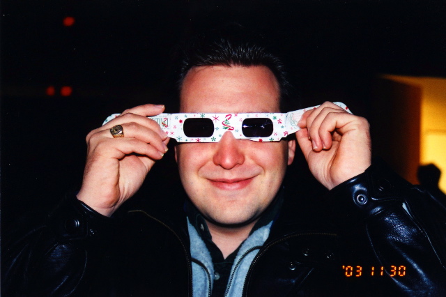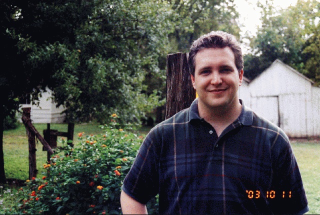 Andrew stands near some flowers for Erica to try out her new lens on her camera. | Andrew in "Snowflake" Glasses